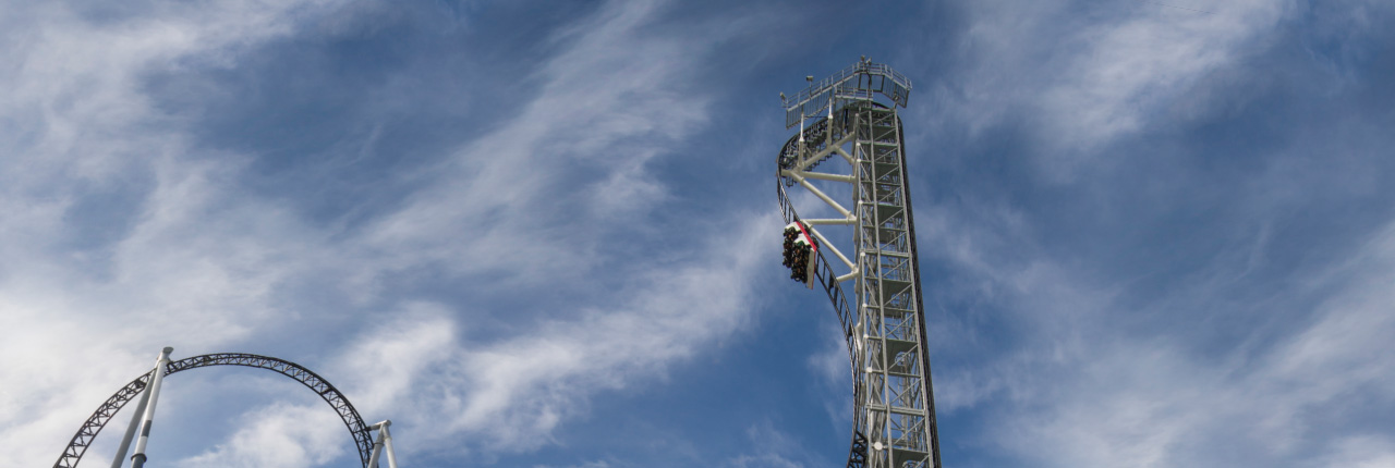 垂直上昇感受「仰望藍天攀升」,接著「車身在向下之際短暫停止」,最後「沿著最大傾斜121度的軌道直落」,讓人刺激屏息的尖叫體驗,等待您來感受。